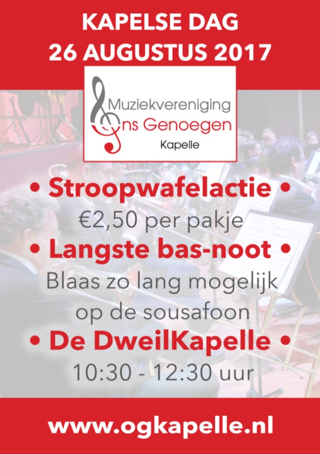 Op de jaarlijkse Kapelse Dag is Ons Genoegen weer aanwezig met een kraam. In dit kraam zijn pakjes stroopwafels te koop. De stroopwafels kosten €2,50 per pakje.